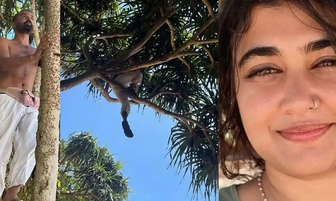 ഒരു മരത്തിന് മുകളിൽ അനായാസമായി കയറി നിൽക്കുന്ന പ്രണവിന്റെ ചിത്രമാണ് കാണുന്നത്.