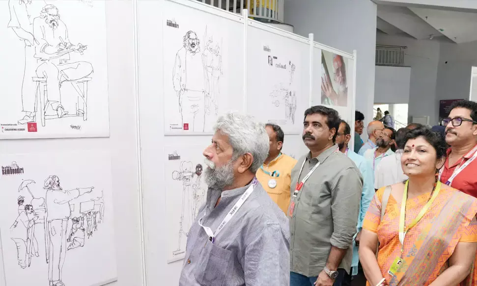 തിരുവനന്തപുരം: കേരളത്തിലെ സമകാലീന ചിത്രകലയുടെ ഭാഷയില് തന്റെ സവിശേഷ രേഖാചിത്രങ്ങളും ദൃശ്യ ഭാവനയും കൊണ്ട് വ്യക്തിമുദ്ര പതിപ്പിച്ച ആര്ട്ടിസ്റ്റ് നമ്പൂതിരിയുടെ തിരഞ്ഞെടുത്ത സിനിമാ ലൊക്കേഷന് സ്കെച്ചുകളുടെ പ്രദര്ശനം കൈരളി തിയേറ്ററില് ആരംഭിച്ചു. നമ്പൂതിരിയുടെ ജന്മശതാബ്ദി ആഘോഷങ്ങളുടെ ഭാഗമായാണ് ഈ പ്രദര്ശനം സംഘടിപ്പിച്ചത്. പ്രശസ്ത സംവിധായകനും കേരള സംസ്ഥാന ചലച്ചിത്ര അക്കാദമി മുന് ചെയര്മാനുമായ ടി.കെ. രാജീവ് കുമാര് പ്രദര്ശനം ഉദ്ഘാടനം ചെയ്തു.