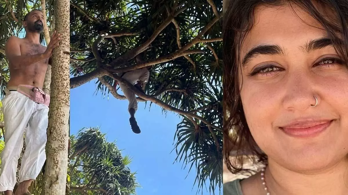 ഒരു മരത്തിന് മുകളിൽ അനായാസമായി കയറി നിൽക്കുന്ന പ്രണവിന്റെ ചിത്രമാണ് കാണുന്നത്.