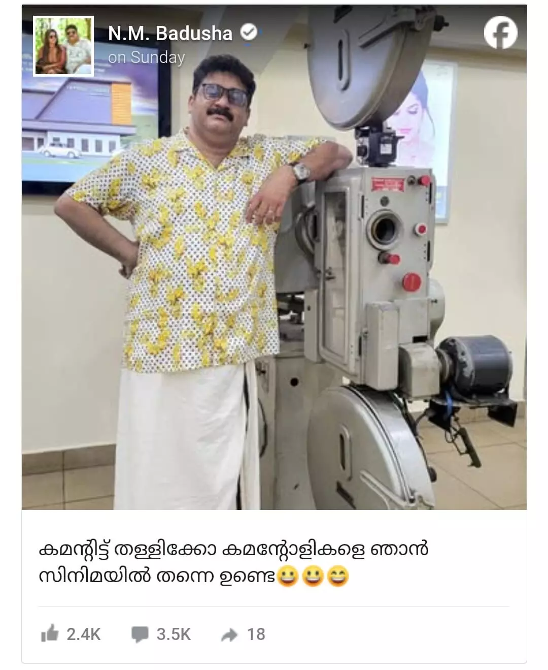നടൻ ഹരീഷ് കണാരന്റെ ആരോപണങ്ങൾക്ക് മറുപടിയുമായി നിർമാതാവും പ്രൊഡക്ഷൻ കണ്ട്രോളറുമായ എൻ.എം.ബാദുഷ രംഗത്ത് വന്നിരുന്നു. കടം വാങ്ങിയ 20 ലക്ഷം തിരികെ നൽകാതിരിക്കുകയും സിനിമകളിൽ നിന്ന് അവസരം നഷ്ടപ്പെടുത്തുകയും ചെയ്തെന്ന ഹരീഷ് കണാരന്റെ ആരോപണങ്ങൾക്കാണ് ബാദുഷ ഇന്നലെ പത്രസമ്മേളനം വിളിച്ച് മറുപടി പറഞ്ഞത് . ഹരീഷിൽ നിന്ന് പണം വാങ്ങിയിട്ടുണ്ടെന്ന് സ്ഥിരീകരിച്ച ബാദുഷ ഹരീഷ് പറഞ്ഞ തുകയിൽ മാറ്റമുണ്ടെന്നും പ്രതികരിച്ചു. 20 ലക്ഷമാണ് വായ്പയായി ചോദിച്ചത്. ലഭിച്ചത് 14 ലക്ഷമാണ്. 7 ലക്ഷത്തോളം തിരികെ നൽകി. ബാക്കി തുക ഹരീഷിന്റെ 72 സിനിമകളുടെ ഡേറ്റ് മാനേജ് ചെയ്തതിന്റെ പ്രതിഫലമായി കണക്കാക്കുമെന്ന് കരുതിയെന്നും ബാദുഷ പറയുന്നു.ഇപ്പോഴിതാ ഫെയ്സ്ബുക്ക് പോസ്റ്റുമായി എത്തിയിരിക്കുകയാണ് ബാദുഷ. ‘കമന്റിട്ട് തള്ളിക്കോ കമൻ്റോളികളെ ഞാൻ സിനിമയിൽ തന്നെ ഉണ്ടെ’ എന്നാണ് ചിത്രം പങ്കുവച്ച് എഴുതിയിരിക്കുന്നത്. കടം വാങ്ങിച്ചിട്ടുണ്ടെങ്കിൽ അത് തിരിച്ചു കൊടുക്കാനുള്ള സാമാന്യ മര്യാദ കാണിക്കണം എന്നാണ് കമന്റ് പൂരം. ഹരീഷിനായി 5 വർഷം 72 സിനിമകൾക്ക് ഡേറ്റ് മാനേജ് ചെയ്തു. ചെയ്ത സേവനത്തിന് ഒരു പണവും വാങ്ങിയില്ലെന്നും പ്രതിഫലം തരാൻ ഹരീഷ് മനസ് കാണിച്ചില്ലെന്നും ബാദുഷ ആരോപിച്ചു.ആരോപണത്തിന് ശേഷം മകൻ കോളേജിൽ പോയിട്ടില്ല. അവന്റെ ഭാവി പോയി. മകളുടെ പേജിൽ വരെ സൈബറാക്രമണം ഉണ്ടായി. സൈബർ ആക്രമണം നടത്തിയവർക്കെതിരെ നിയമപരമായ നടപടി സ്വീകരിക്കും. സൈബർ സെല്ലിന് പരാതി നൽകും. കുടുംബത്തിന് എതിരെ ആരോപണം വന്നതിനാലാണ് വാർത്താസമ്മേളനത്തിൽ ഇക്കാര്യം പറയുന്നതെന്നും ബാദുഷ പറഞ്ഞു.
